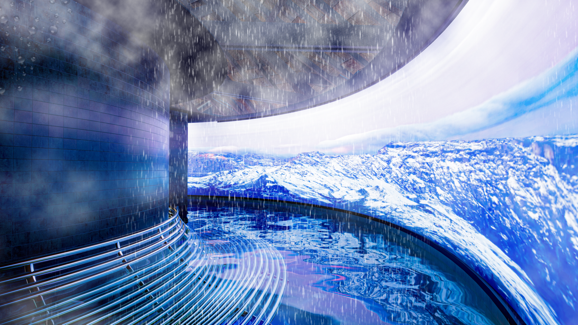 : l’espace bains mouvants où un grand panneau LED circulaire de 15 mètres de long projettera des images autour des quatre saisons. Pour s’y croire pleinement, brume, crachin ou neige voletteront au-dessus des usagers.